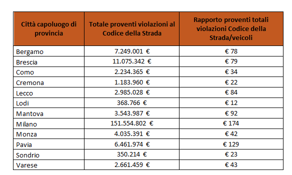 Rapportando le somme incassate con il numero di autovetture e motocicli iscritti nei registri della motorizzazione, la classifica lombarda cambia, anche se non per la prima posizione, dove si trovano ancora i guidatori milanesi.