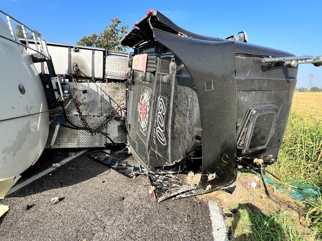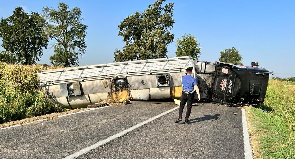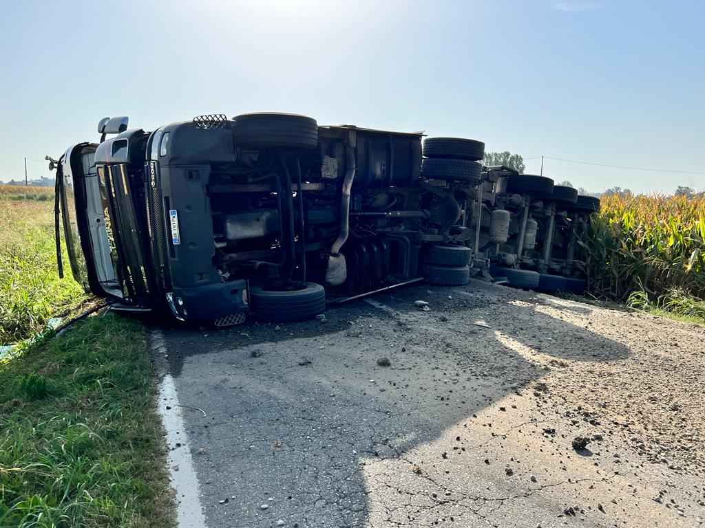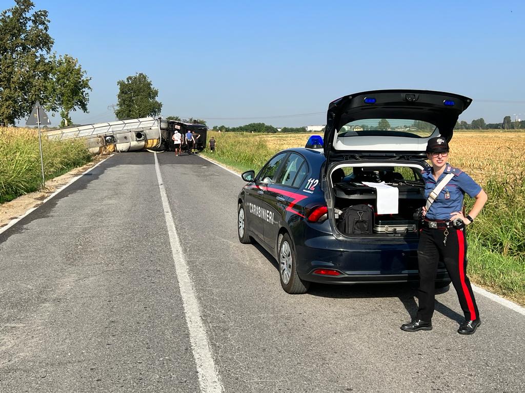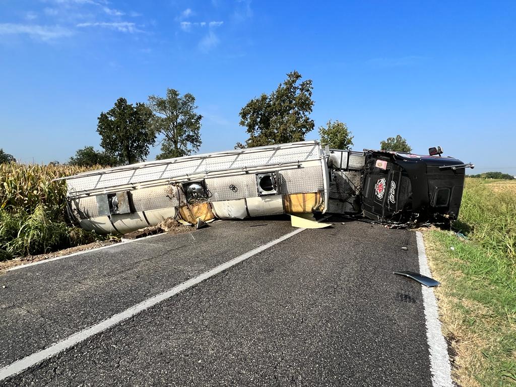 Caos e viabilità bloccata lungo la bassa per Casalmaggiore, tra Quattro Strade e Forcello, dove un’autocisterna che trasportava siero di latte si è ribaltata in orizzontale in mezzo alla strada. Fortunatamente il conducente ne è uscito illeso, ma è stato necessario l’intervento dei Vigili del Fuoco, che hanno dovuto mettere in sicurezza il mezzo, che stava sversando carburante all’esterno.