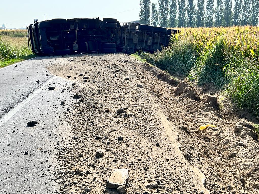 Camion ribaltato in mezzo a strada,
