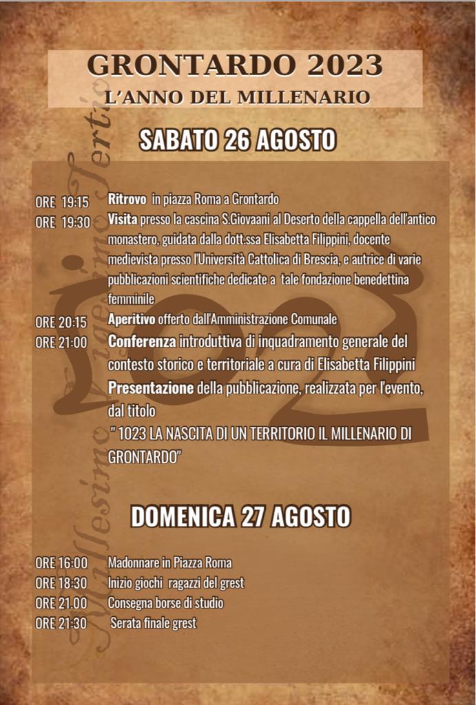 Oltre mille anni fa nasceva Grontardo. Proprio per ricordare questo anniversario, l’Amministrazione comunale ha deciso di organizzare una due giorni di full immersion culturale, con momenti artistici, conferenze, presentazione di un libro, ma anche momenti ludici per i più piccoli.