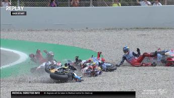 Incidente alla prima curva del Gp di Catalogna classe MotoGp, con bandiera rossa e stop alla gara. Paura per Pecco Bagnaia, scattato dalla pole position e caduto alla curva 2 con la Ducati. Mentre era a terra, il campione del mondo è stato colpito ad una gamba dalla Ktm del sudafricano Brad Binder. Il pilota iridato, che non ha perso conoscenza, è stato portato in ambulanza al centro medico per controlli e successivamente in ospedale.