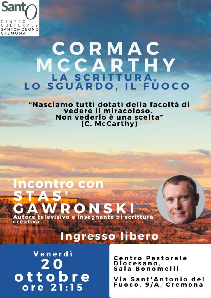 A Cormac McCarthy è dedicato l’incontro organizzato dal Centro Culturale S. Omobono, intitolato “La scrittura, lo sguardo, il fuoco”, che si terrà venerdì 20 ottobre, alle ore 21:15, presso la sala Bonomelli del Centro pastorale diocesano (via S. Antonio del Fuoco 9/a). A intrattenere il pubblico, sarà chiamato Stas Gawronski, autore televisivo e insegnante di scrittura creativa.