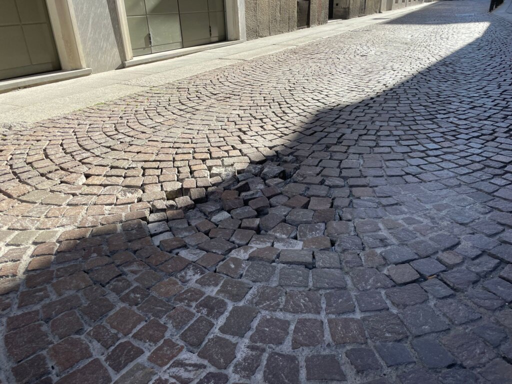 AGGIORNAMENTO – Nel pomeriggio di mercoledì la buca creatasi dallo spostamento di sanpietrini in via Capra Plasio è stata sistemata, con una copertura di asfalto.