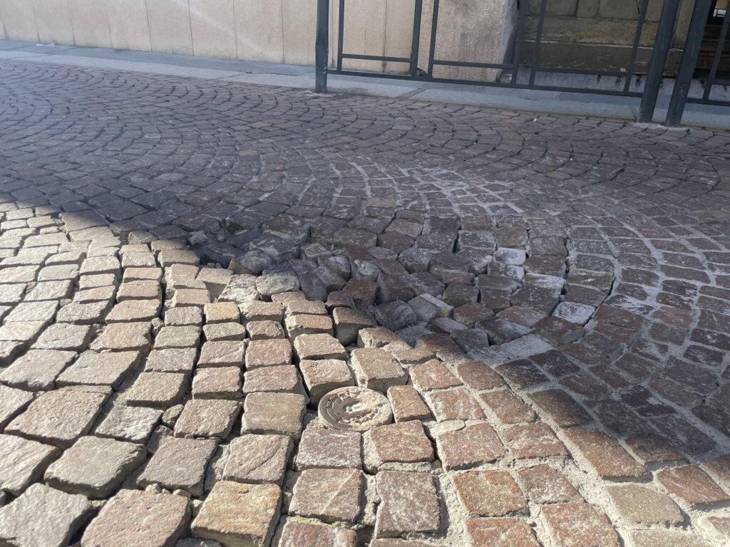 Il buco si era creato proprio di fronte all’ingresso della scuola Capra Plasio: da mesi la strada era dissestata perché si erano sollevati alcuni grossi sanpietrini che caratterizzano il manto stradale.