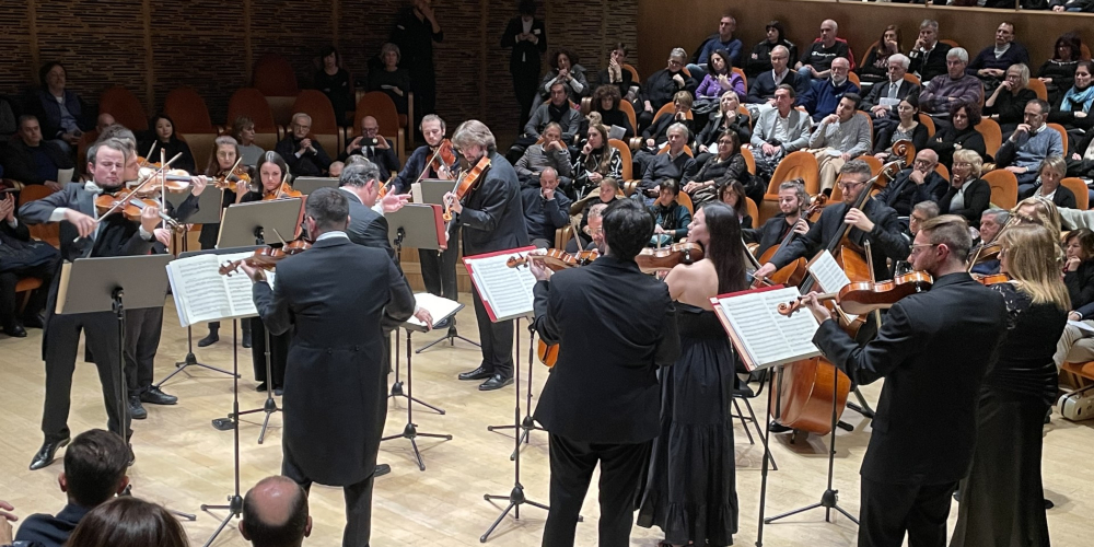 In scena, con un vivace programma che ha spaziato fra Boccherini, Verdi e Bach, l’Accademia Concertante d’Archi di Milano diretta dal M° Benaglia, che ha sottolineato quanto i musicisti fossero affiatati come i compagni di una squadra di calcio e l’Auditorium con il suo pubblico avvolgente ricordasse la curva di uno stadio.