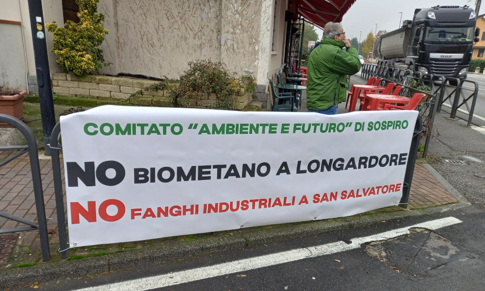 Si fa sentire con uno striscione eloquente il Comitato sorto a Sospiro contro i due progetti industriali proposti su territorio comunale: l’impianto di biometano a Longardore (53mila tonnellate all’anno di conferimenti tra reflui zootecnici, scarti alimentari, produzioni agricole di cui ben 14mila tonnellate di cereali); e quello di trattamento fanghi da depurazione industriale a San Salvatore.