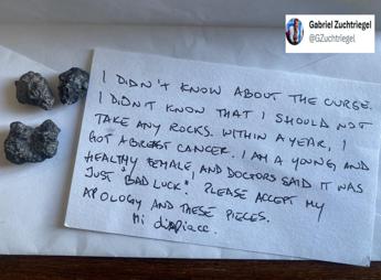 (Adnkronos) – “Caro anonimo mittente di questa lettera… Le pietre pomice sono arrivate a Pompei… Ora in bocca al lupo per il tuo futuro come diciamo in Italia”. E’ la risposta su X del direttore del Parco archeologico Gabriel Zuchtriegel a una lettera di una turista straniera con allegate le pietre pomice trafugate. “Non sapevo della maledizione. Non sapevo che non avrei dovuto prendere delle pietre. Nel giro di un anno mi sono accorta del cancro” ha scritto nella missiva che conteneva anche la pomice. “Sono giovane ed ero anche in buona salute, il medico ha detto che è stata soltanto ‘sfortuna’. Per favore accetti le mie scuse. ‘Mi dispiace’ (scritto in italiano, ndr.)”.