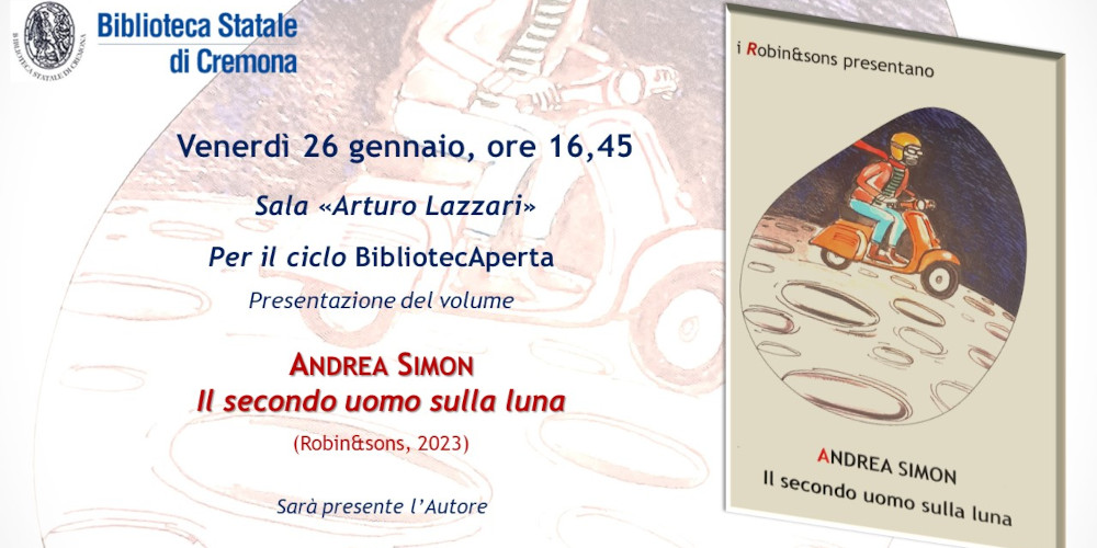 Venerdì 26 gennaio, ore 16.45, in sala “Arturo Lazzari” nuovo appuntamento con il ciclo BibliotecAperta, con la presentazione del libro Il secondo uomo sulla Luna di Andrea Simon (Robin&sons, 2023). L’autore sarà in sala, e la presentazione sarà trasmessa in diretta sulla pagina Facebook della Biblioteca Statale di Cremona.