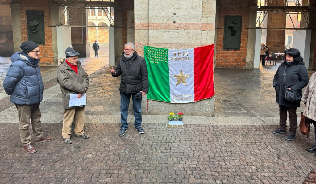 Nel pomeriggio di sabato, alle 16 in cortile Federico II a Cremona l’appuntamento del Comitato provinciale dell’Anpi: un raduno attorno alle pietre d’inciampo di palazzo comunale, cui ha partecipato qualche decina di persone.