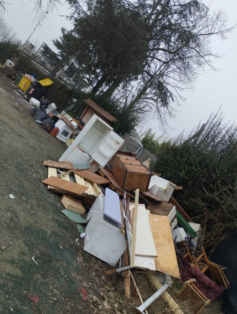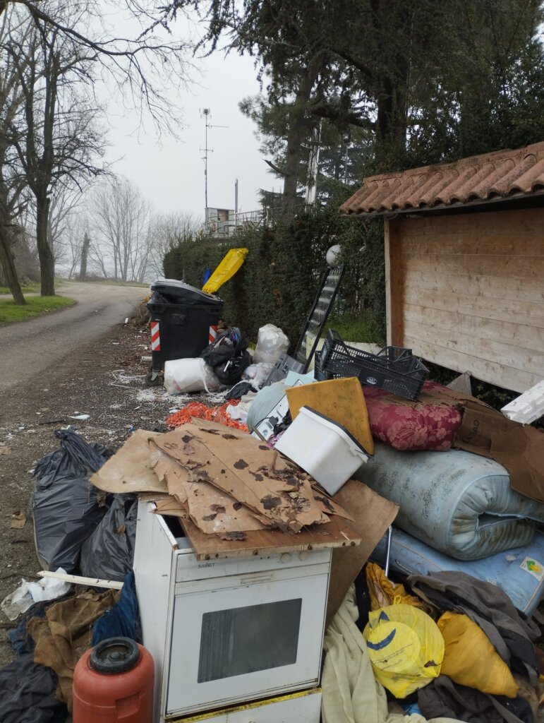 Non solo sacchi neri pieni di spazzatura lasciati in mezzo all’erba, ma anche interi mobili abbandonati lungo la via. Tra i rifiuti sono presenti anche materassi, un vecchio frigorifero e addirittura un forno.