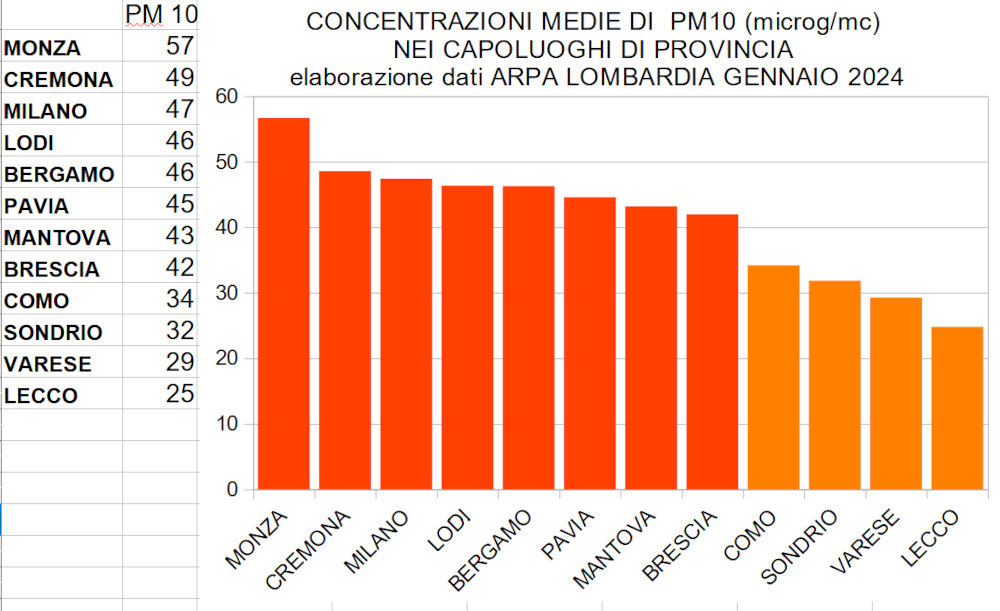 Un mese gennaio decisamente disastroso dal punto di vista della qualità dell’aria. A fare l’analisi della situazione è Legambiente Lombardia. Emerge che il nostro territorio è secondo, dopo Monza e Brianza, per la concentrazione media di polveri sottili Pm10, che è stata pari a 49 microgrammi per metro cubo.