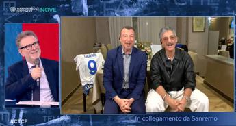 Amadeus commenta: “Lui è molto aziendalista”. I due si collegano mentre è in corso il big match Inter-Juve. La loro Inter è in vantaggio, “ma non bisogna rilassarsi”. Dietro di loro campeggia la maglia di Thuram con il numero 9.
