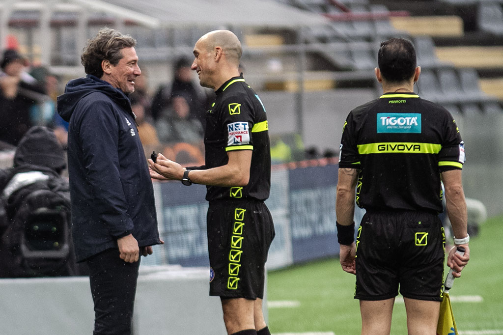Stroppa alla vigilia aveva preannunciato una notte di dubbi, non pensando di doversi svegliare con una certezza: l’assenza di Ravanelli, recuperato in settimana ma steso da un attacco virale. Senza di lui, il tecnico è costretto a ridisegnare la difesa riportando Bianchetti al centro e abbassando Sernicola, con Lochoshvili a sinistra. L’out di destra diventa di competenza di un troppo timido Ghiglione, sulla mancina invece sgroppa Johnsen, che dopo l’impiego da mezz’ala e da trequartista a Lecco viene dirottato sull’esterno lasciando a Falletti la zolla a sinistra di Castagnetti, con Abrego a fare legna sul lato opposto. Davanti torna Vazquez alle spalle di Coda. Proprio il Mudo fa surriscaldare uno Zini docciato da una giornata di piogge senza tregua. L’argentino dà l’impressione di non ingranare l’ultima marcia e quando si aggiusta il mancino per bucare Bardi prima dell’intervallo il suo passo cadenzato finisce col far fare un figurone a Rozzio.