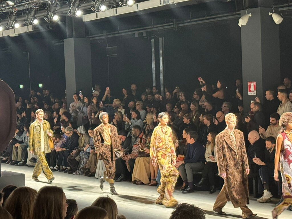 E proprio da Etro (promossa la collezione di Marco de Vincenzo) un parterre ricchissimo di ospiti: Angelina Mango, “assediata” dai fan fuori dallo show, Miriam Leone, Bianca Balti e Gianmarco Saurino. La sfilata nella parte più nuova della città, sotto i grattacieli di Porta Nuova, una meraviglia della nuova Milano verticale. Fb