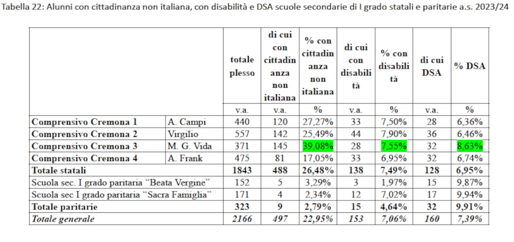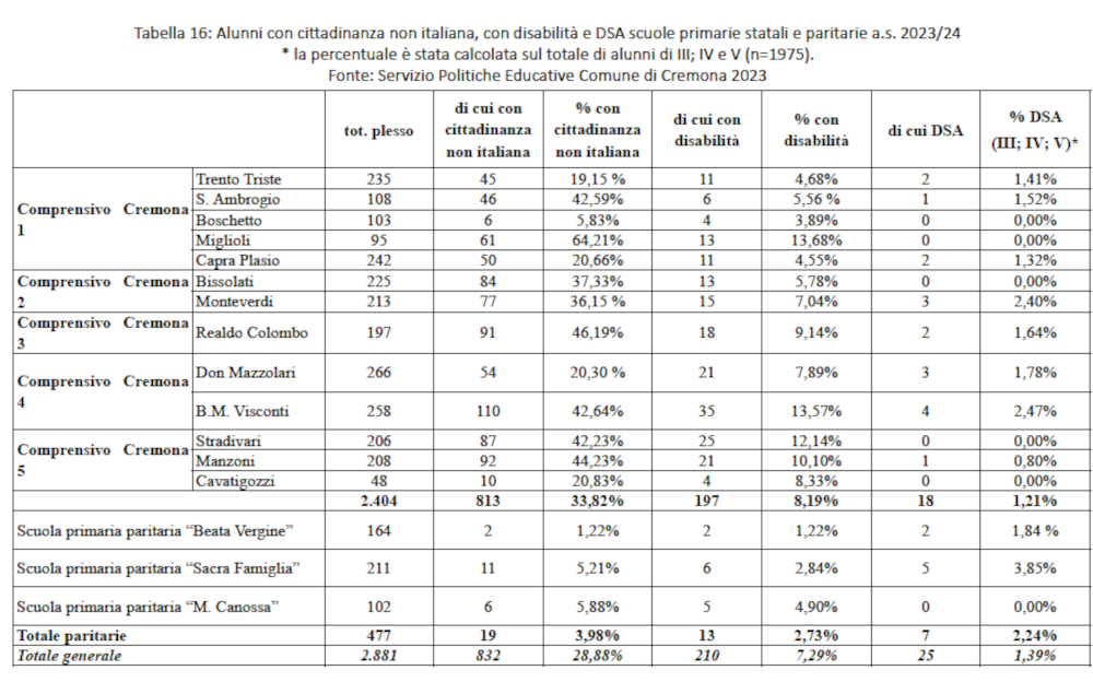 I dati fanno emergere il profilo marcatamente multiculturale del sistema scolastico della città di Cremona, che si caratterizza per l’elevata incidenza complessiva di studenti stranieri, con un valore (21,34%) più che doppio di quello registrato su scala nazionale e superiore anche a quello della regione Lombardia.
