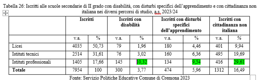 Tra le curiosità per l’anno scolastico 2023/2024 iscritti a Cremona oltre il 50% degli studenti ha scelto il liceo, il 31,61 gli istituti tecnici e il 17,66 i professionali, frequentati per lo più da studenti che non hanno cittadinanza italiana. La ricerca ha interessato anche il Centro Provinciale di Istruzione degli Adulti che nella fascia d’età 18-30 anni sono soprattutto donne e in prevalenza maschi nella fascia di età over 40.
