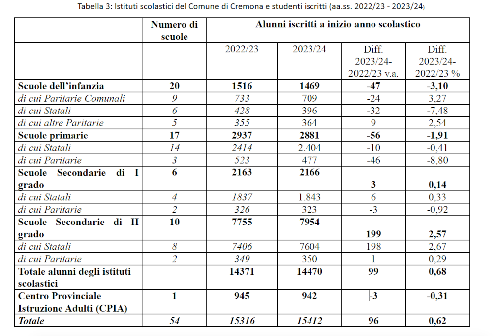 Nell’anno scolastico 2023/24 la popolazione scolastica complessiva è aumentata rispetto all’anno precedente, da 14.371 a 14.470 ma solo grazie all’aumentato numero di studenti delle scuole superiori provenienti da altri Comuni.