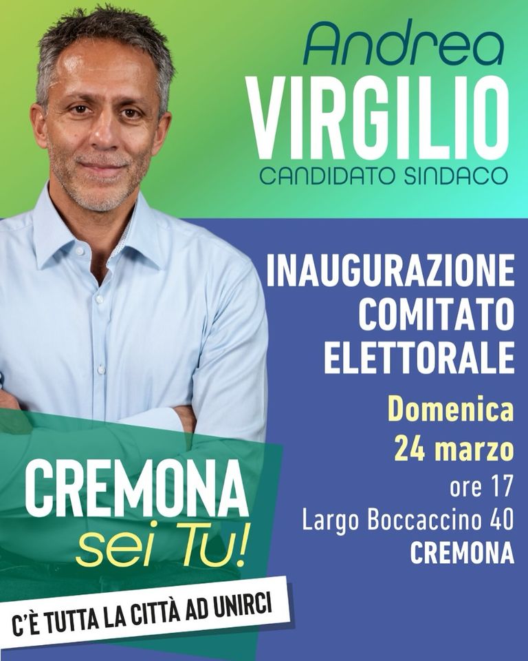 Si terrà domenica prossima 24 Marzo alle 17 l’inaugurazione della sede del Comitato elettorale di Andrea Virgilio, candidato sindaco per il centrosinistra, in Largo Boccaccino 40. “Inauguriamo il nostro Comitato Elettorale con l’idea di una Cremona ancora più aperta, inclusiva, una Cremona che ascolta e valorizza il protagonismo di chi la vive ogni giorno”, affermano i promotori della coalizione che vede uniti Partito Democratico, Alleanza Verdi – Sinistra, liste civiche Fare Nuova la Città- Cremona Attiva.