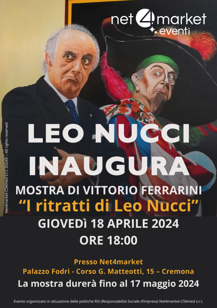 Giovedì 18 aprile alle ore 18 l’evento verrà inaugurato a Palazzo Fodri in corso Matteotti 15 a Cremona, nella sede di Net4market sotto al lucernario, con l’eccezionale presenza proprio di Leo Nucci a compimento di questo bellissimo lavoro di Ferrarini che verrà presentato al pubblico cremonese accompagnato dalla presenza sapiente della critica d’arte Tiziana Cordani.