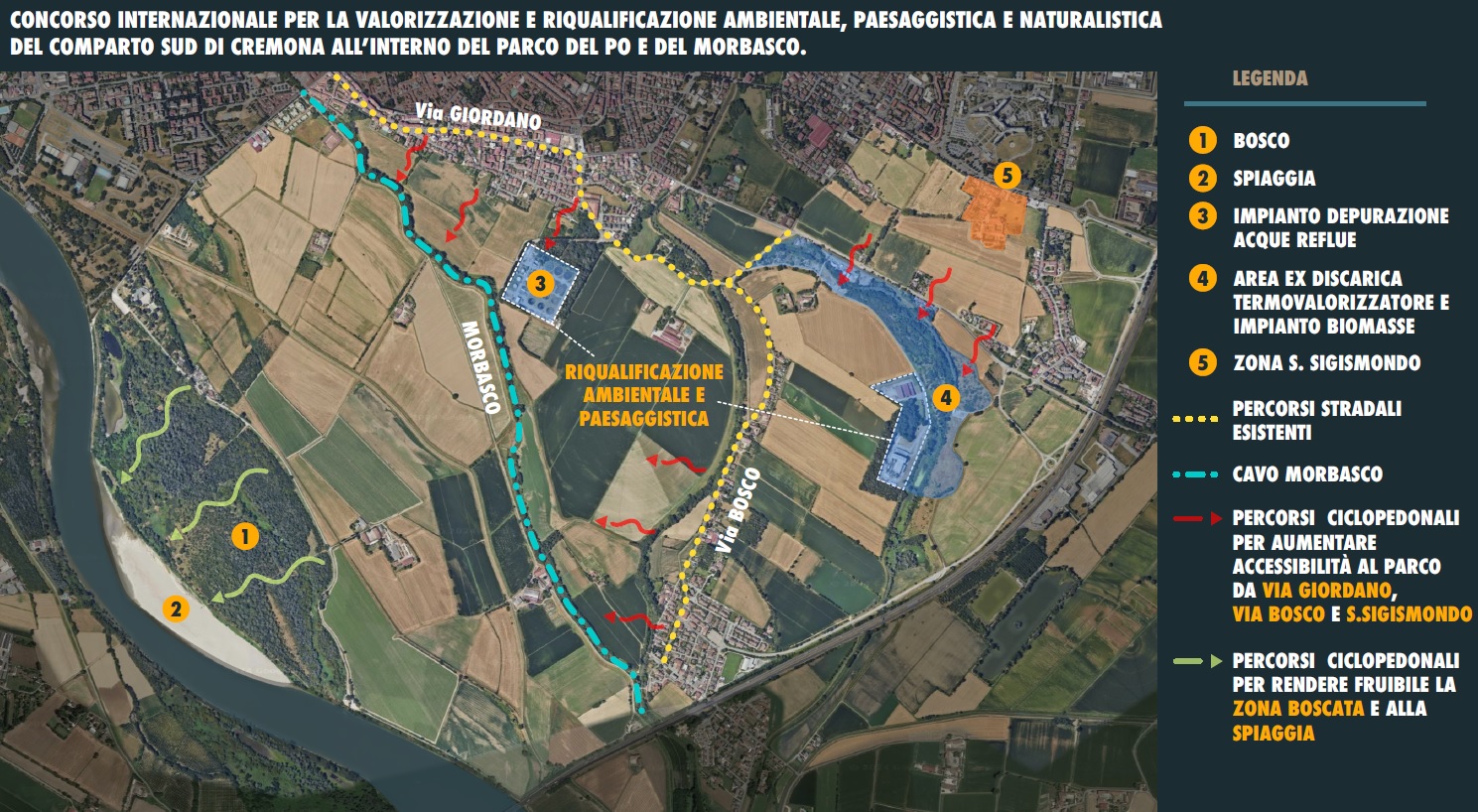 Questi gli obiettivi da raggiungere: individuazione e creazione di nuovi accessi pedonali e ciclabili al Parco del Po e del Morbasco dalla Via Giordano, una volta riqualificata, e da San Sigismondo, avendo cura di mantenere la permeabilità dei suoli. Creazione di nuovi percorsi ciclabili e pedonali per intensificare la fruibilità, in maniera omogenea, del parco da parte dei cittadini e dei turisti. I individuazione di potenziali punti di ristoro tramite il recupero di edifici esistenti o la realizzazione di piccoli chioschi stagionali, facilmente rimovibili. Rigenerazione ambientale delle zone interessate dalla presenza di impianti dedicati al trattamento e lo smaltimento dei rifiuti di via San Rocco. Realizzazione di camminamenti e posa di segnaletica e piccole attrezzature per consentire la fruizione del parco, delle lanche e dei bodri, anche da parte di famiglie e scolaresche. Potenziamento del patrimonio arboreo attraverso la piantumazione di ripe boscate, filari e nuove aree verdi, in accordo con le proprietà. Le essenze vegetali saranno scelte tra quelle autoctone. Realizzazione di interventi volti a preservare le biodiversità presenti e la fauna autoctona. Incremento dell’attività di vigilanza a tutela dell’ambiente, fruendo in primis delle scarsamente valorizzate Guardie Ecologiche Volontarie dello stesso PLIS. E’ prevista anche la creazione di diversi sentieri di raggiungimento delle sponde del fiume Po, che diventano una grande spiaggia per i cremonesi.
