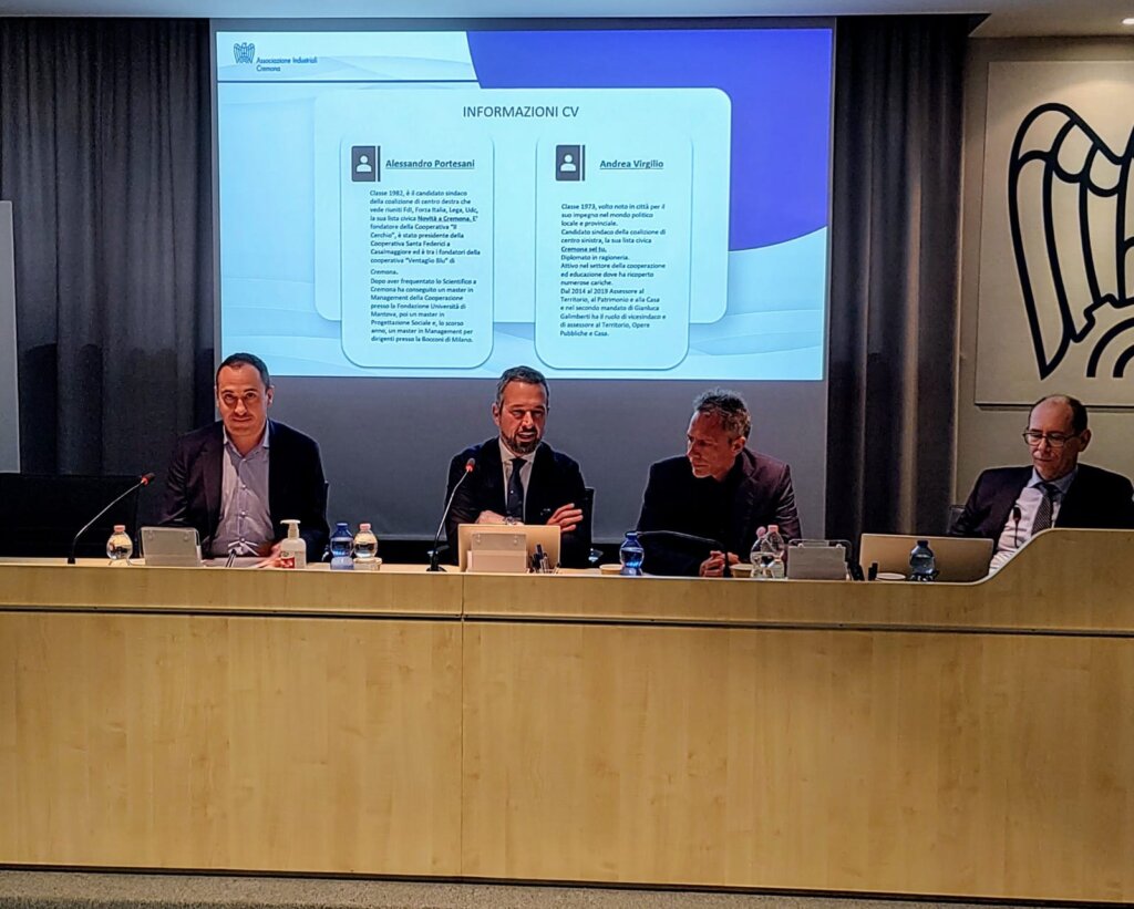 Primo confronto martedì pomeriggio tra due dei candidati alla carica di sindaco, Alessandro Portesani per il centrodestra e Andrea Virgilio per il centrosinistra, un’iniziativa dell’Associazione Industriali a margine della riunione del Consiglio generale. Sollecitati dalle domande del presidente Stefano Allegri, si è parlato del ruolo di Cremona capoluogo, infrastrutture, A2A, ente Fiera, eventi in grado di essere motivo di attrazione per la città.