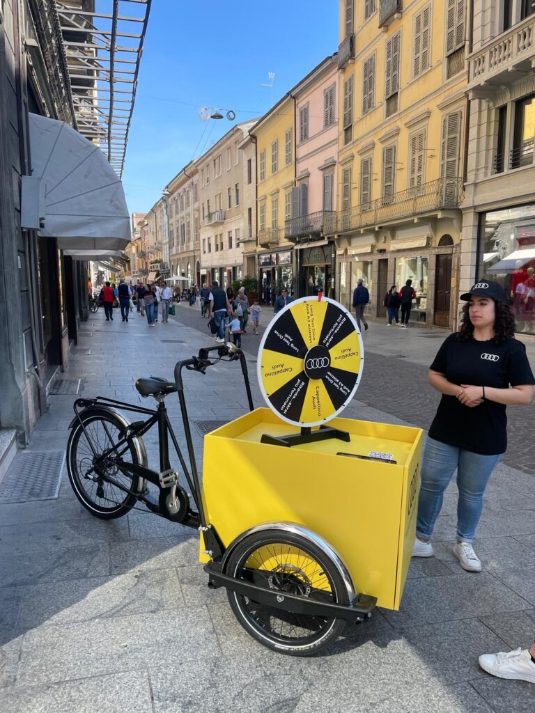 Risolto il mistero delle videoproiezioni che qualche sera fa avevano illuminato alcuni palazzi del centro di Cremona con la scritta “segui la bici gialla” e l’indicazione di una data, quella dell’11 maggio. Si è trattato di un’originale iniziativa promozionale di Bossoni Automobili, per far divertire e giocare le persone con una ruota della fortuna posizionata per le vie del centro. Con l’invito a visitare gli showroom Audi Bossoni Automobili per conoscere la nuova Audi A3 allstreet.