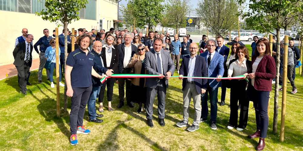 L’inserimento di 2.300 metri quadrati di aree a prato e la piantumazione di 52 alberi e numerosi arbusti, unitamente alla scelta delle colorazioni chiare delle pavimentazioni drenanti, contribuisce fortemente a ridurre l’aumento delle temperature estive locali (isola di calore). Il giardino è composto da specie arboree autoctone a bassa richiesta d’acqua d’irrigazione, per adattarsi ai noti cambiamenti climatici, con fioriture differenziate nell’arco dell’anno per creare un piccolo boschetto urbano, utile – tra l’altro – a rendere gradevole l’ambiente di lavoro.