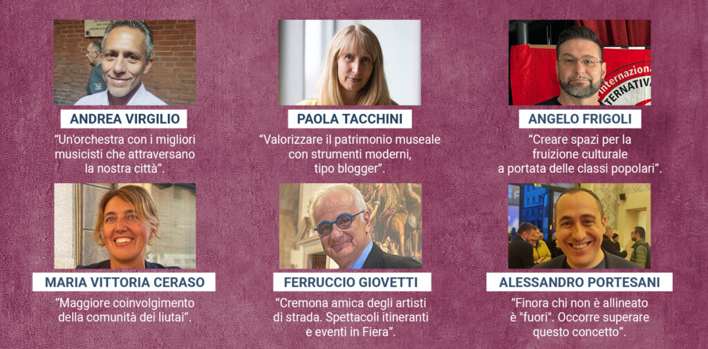 Alessandro Portesani. Uno dei primi atti della nostra amministrazione sarà quello di mettere attorno ad un tavolo tutti i soggetti sul territorio. Ci sono tante ferite che la Giunta Galimberti/Virgilio ha lasciato. Tensioni nei cda delle Fondazioni. Bocconi amari che non sono stati mai digeriti fino in fondo e faide che si sono consumate tra i velluti rossi del teatro Ponchielli. Dobbiamo riportare la pace e la collaborazione. Ogni associazione ha specificità proprie, vanno potenziate sotto l’egida del Comune. Serve coinvolgere: la Scuola Internazionale di Liuteria, il Dipartimento di Musicologia con il corso di Restauro degli strumenti musicali e Cr.Forma. La liuteria non si esaurisce nella costruzione del violino: ma di tutti i cordofoni. Inoltre, vanno recuperate le forme degli strumenti antichi. Lo sviluppo passa per gli studi dei rapporti fra Cremona e la liuteria.