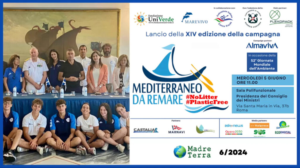 ROMA (ITALPRESS) – Mediterraneo da remare, la campagna itinerante promossa da Fondazione UniVerde in collaborazione con Marevivo, in partnership con Federazione Italiana Canoa e Kayak e con l’adesione del Corpo delle Capitanerie di Porto – Guardia Costiera, con AlmavivA campaign partner e main partner Flexopack, taglia il traguardo della XIV edizione. L’evento di lancio si terrà a Roma, Sala Polifunzionale della Presidenza del Consiglio dei Ministri (via Santa Maria in Via, 37b), mercoledì 5 giugno, ore 11:00, in occasione della 52° Giornata Mondiale dell’Ambiente, in partnership con Castalia, Marnavi e Idroambiente. Focus di MDR 2024 è #NoLitter contro ogni forma di inquinamento dei mari e dei bacini idrografici con particolare attenzione al #PlasticFree.