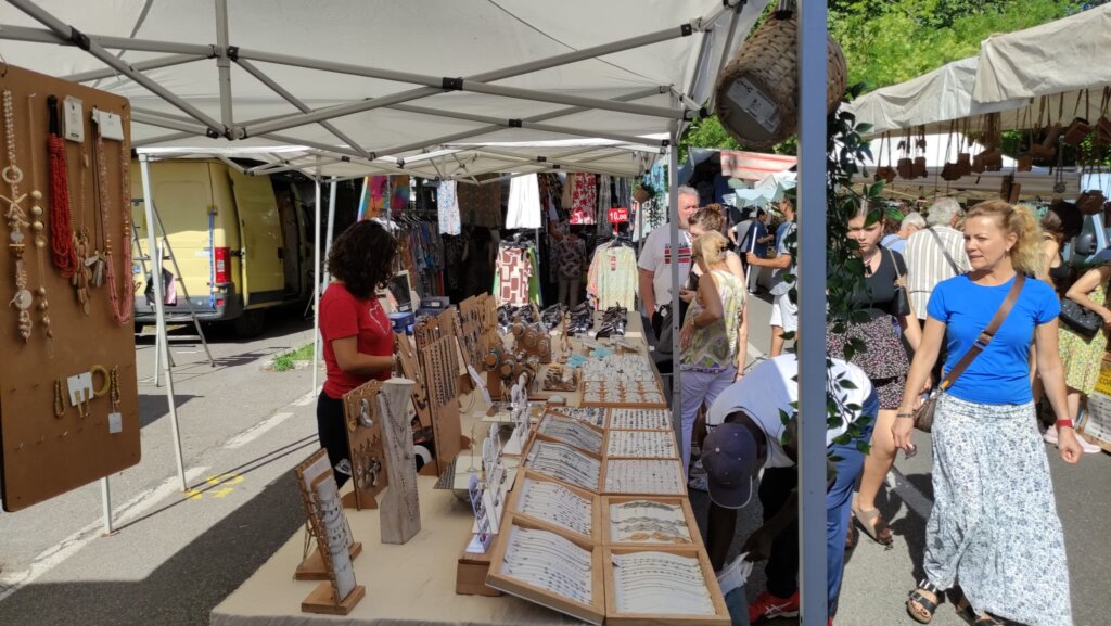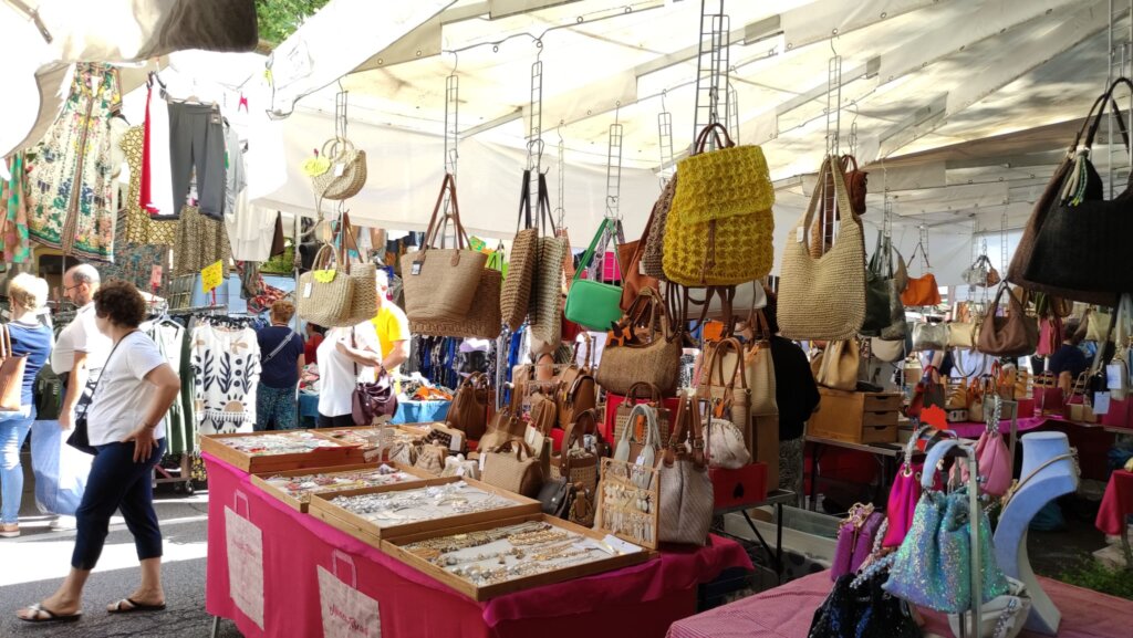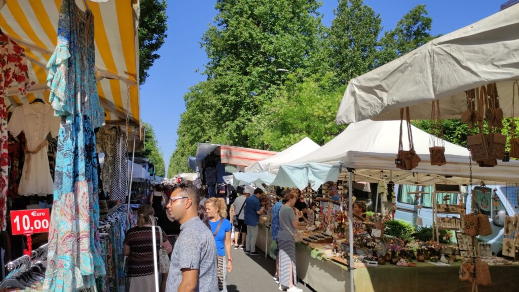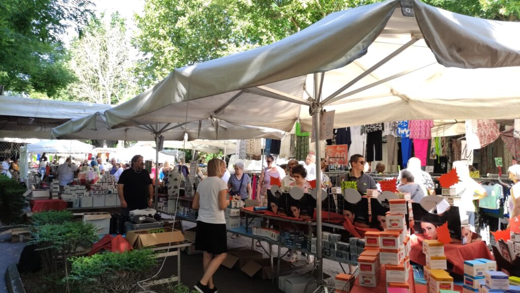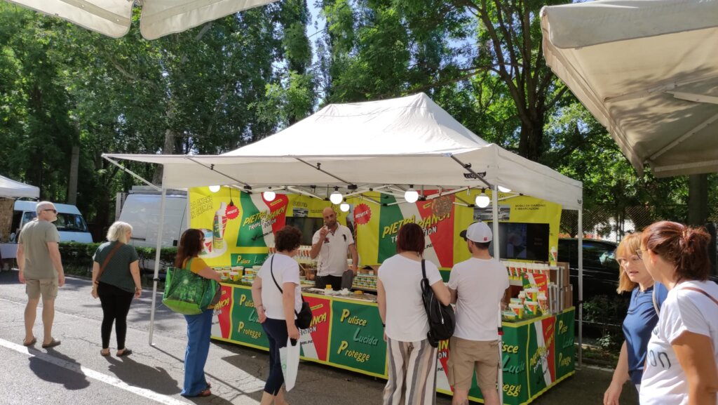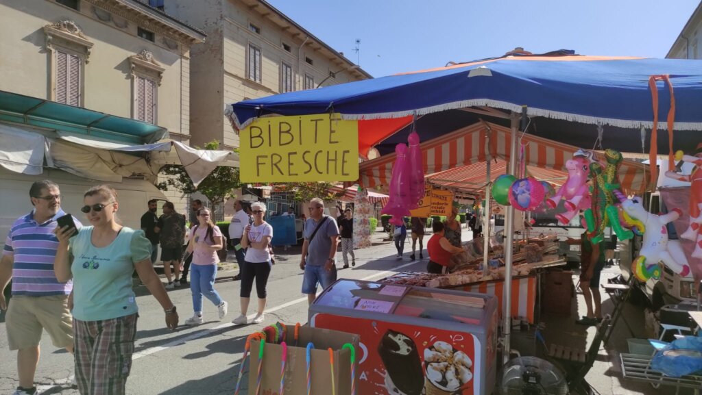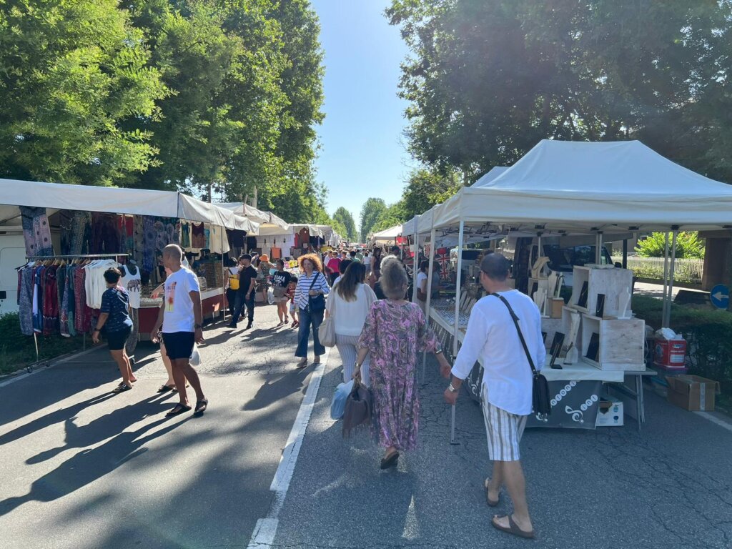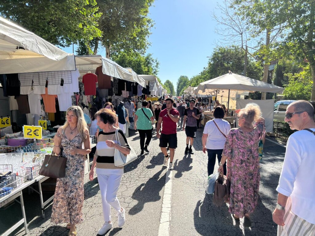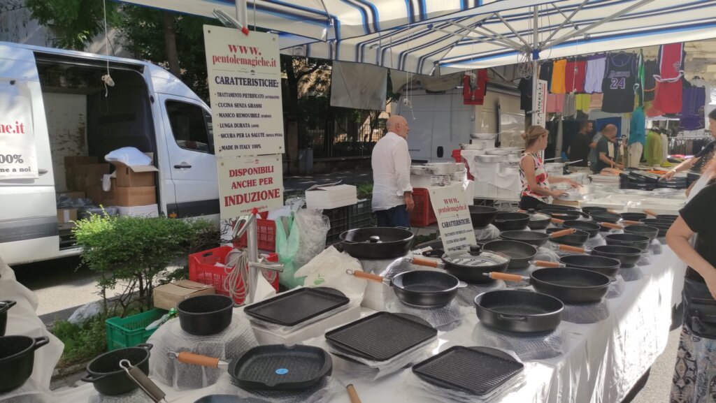 Tanta gente a passeggiare, ma anche ad acquistare, come dimostrano le borsine piene di chi, attorno alle 10, ha già completato il suo giro. Colori, come quelli delle borse e dell’abbigliamento etnico; odori dai banchi gastronomici da varie parti d’Italia; profumi. Ma a rendere davvero caratteristico questo momento di aggregazione sono i gruppi che si formano davanti ai venditori di magici spazzoloni per la pulizia della casa, marsupi multifunzione, prodotti che lavano di tutto le cui proprietà vengono decantate con un’abilità oratorie collaudate. Qualcosa che riesce a ricreare, anche se solo per qualche minuto, un po’ di quel senso di appartenenza a una comunità che caratterizza fiere e mercati e che i vari Amazon o e-bay non possono replicare.