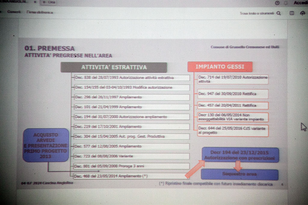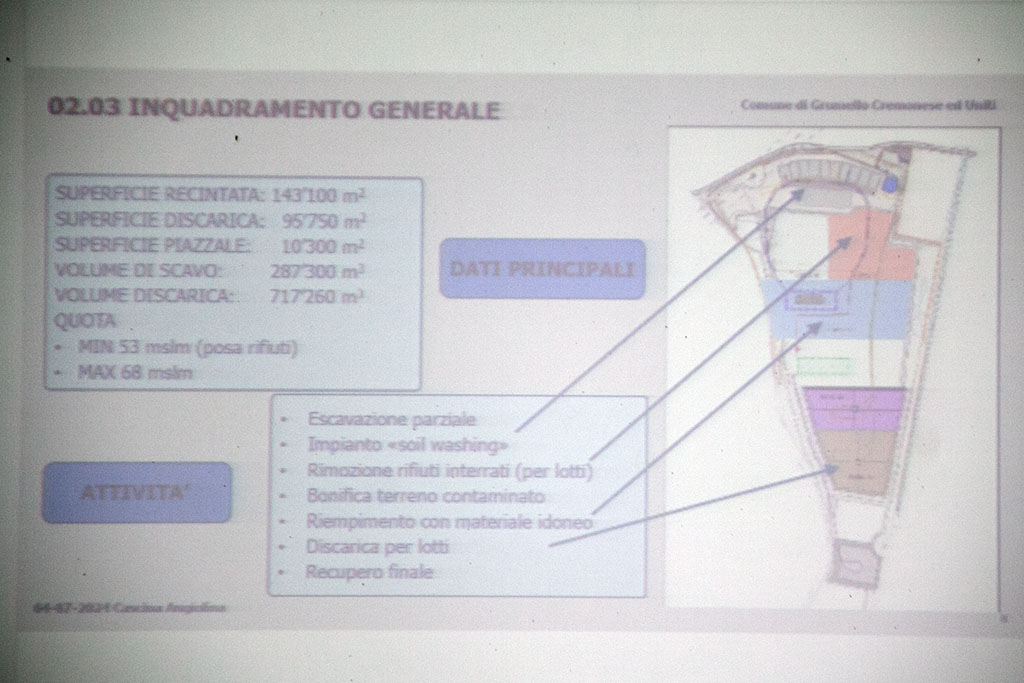 Visigalli ha ripercorso la cronistoria della cava, avviata nel 1993. “Nel 2010 – ha spiegato – è stata attribuita alla cava la possibilità di trattamento di rifiuti non pericolosi, per cui la sua storia come discarica inizia già da quella data. Nel 2013, la vendita parziale della cava ad Acciaieria Arvedi”. Subito dopo l’acquisto emerge la presenza di materiali edili (asfalti, cartongessi, ecc…) attribuibili alla gestione precedente. A quel punto scatta il sequestro per la presenza di scarti di edilizia smaltiti illegalmente, per i quali la società di escavazione (attualmente in liquidazione) ha subìto un procedimento penale.