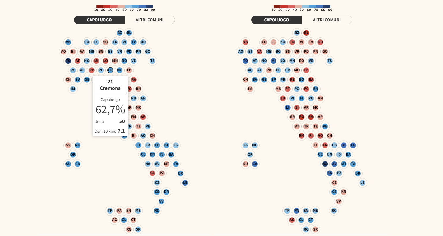 Cremona, con un indice di accessibilità del 33,1% calcolata su base provinciale, presenta una situazione decisamente migliore se si analizza il dato riferito al solo comune capoluogo, che garantisce un accesso più facile ai servizi alimentari ai cittadini con l’indice di accessibilità che sale al 62,7% per la grande distribuzione, mentre si attesta al 51,3% per la piccola distribuzione.