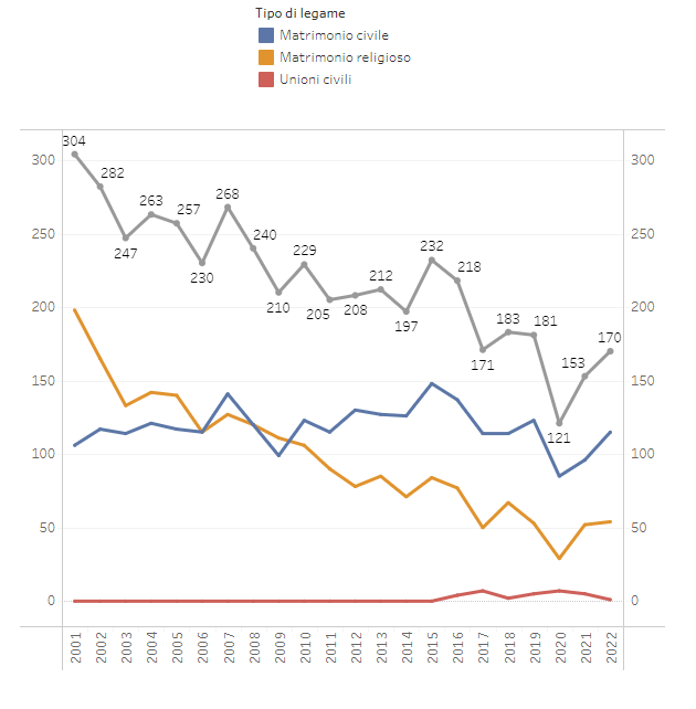 In controtendenza le unioni civili che si registrano soltanto dal 2016, con un record di 7 unioni nel 2017 e nel 2020. Le cause di questa crisi sono tante: il lavoro che manca, l’indipendenza economica che tarda ad arrivare, gli stipendi bassi, la voglia di non avere vincoli sempre più frequente, la crisi demografica, ma anche i costi. Il settore dei matrimoni in Italia alimenta un giro di affari da 3,5 miliardi di euro l’anno. Insomma ci si sposa meno, ma non si rinuncia a spendere.
