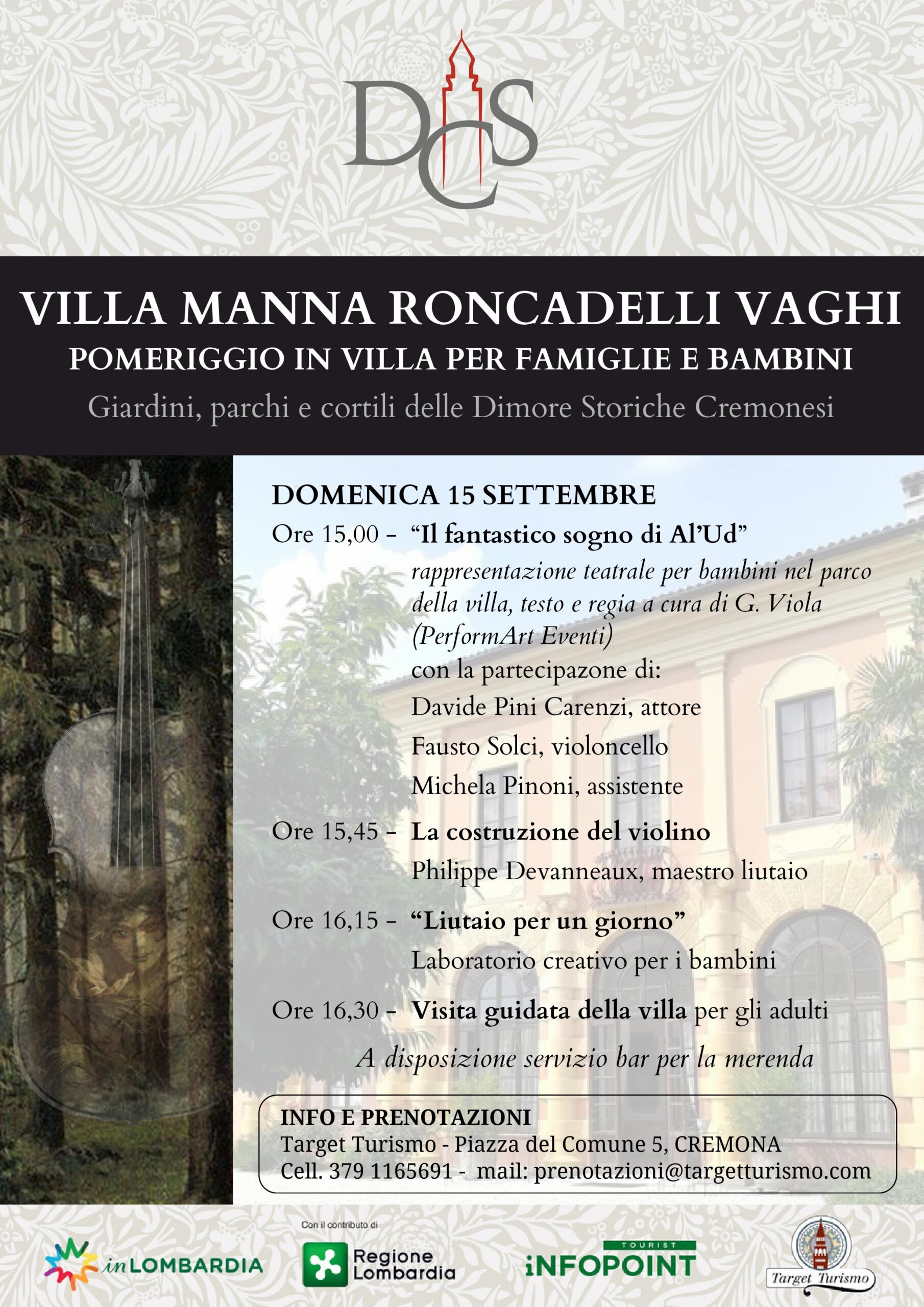 Domenica 15 settembre un pomeriggio tutto dedicato a bambini e famiglie a Villa Manna Roncadelli Vaghi di Grumone di Corte de’ Frati, residenza estiva cinquecentesca immersa nel verde della campagna del fiume Oglio, con un variegato programma di attività: alle ore 15.00 il magico racconto di Al Ud sulla nascita del violino interpretato dall’attore Pini Carenzi accompagnato dalle note del violoncello del maestro FaustoSolci nella suggestiva ambientazione del parco.