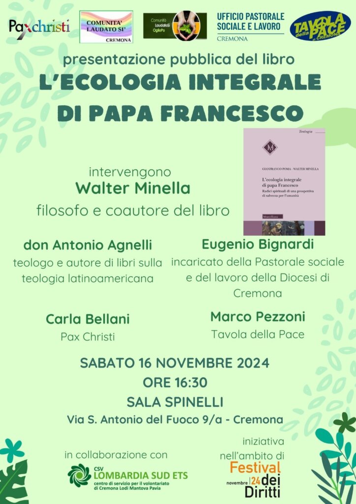 L’iniziativa è promossa da Pastorale sociale e del lavoro, Comunità Laudato Sì Cremona, Comunità Laudato Sì Oglio Po, Pax Christi, Tavola della pace, nell’ambito del Festival dei Diritti 2024 promosso da CSV Lombardia ETS.