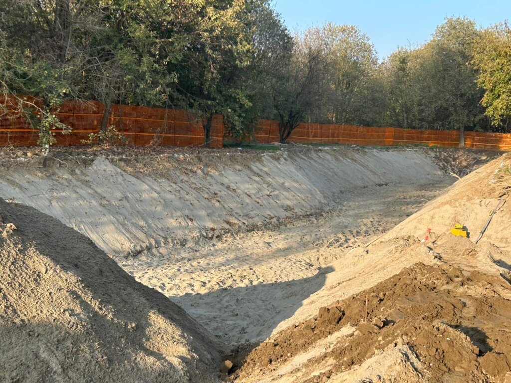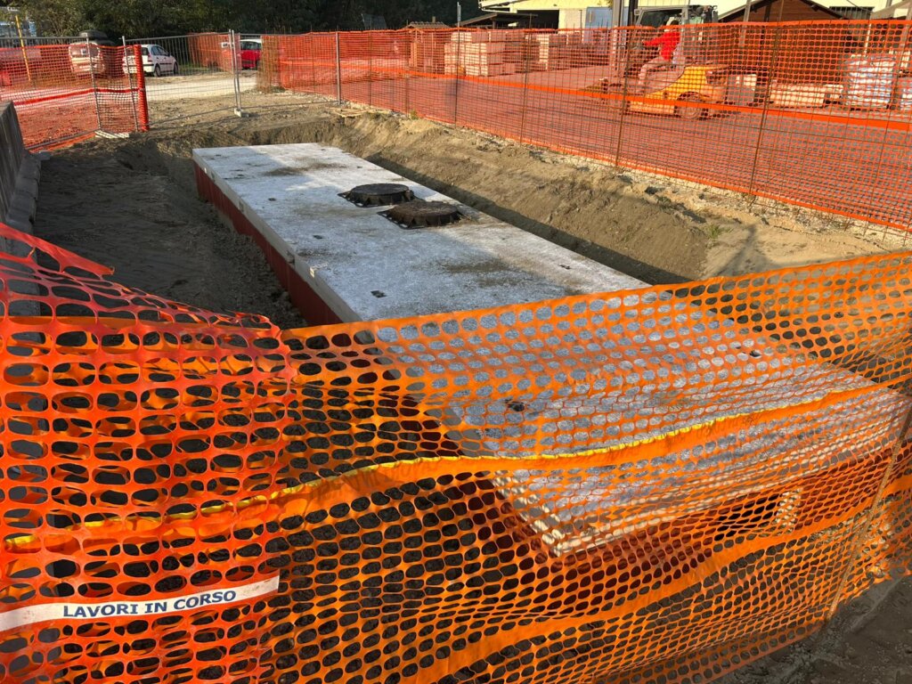 La soluzione individuata per rimediare a questa criticità consiste nella realizzazione di vasche di laminazione e sub-dispersione delle acque piovane, così da minimizzare le portate e i volumi scaricati nella fognatura esistente, con notevole beneficio non solo del comparto del sottopasso, ma di tutta la rete fognaria a valle. La principale vasca di laminazione viene realizzata all’interno del bosco filtro a ridosso del sottopasso, sfruttando le radure presenti.