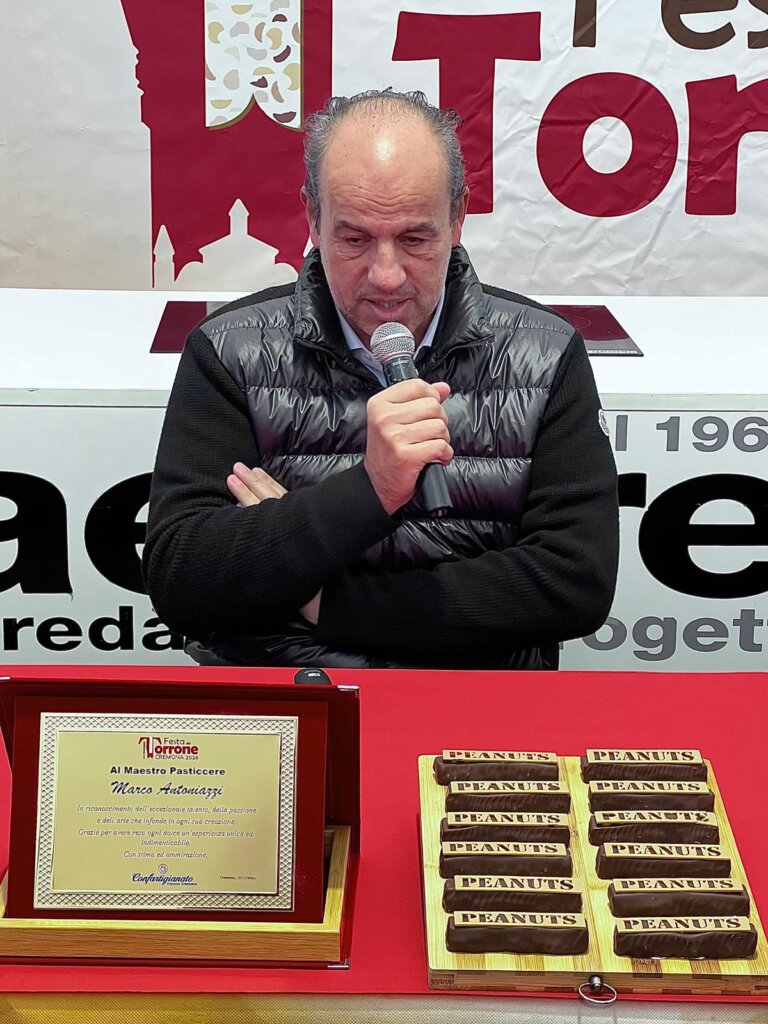 “Il torrone è un pezzo della nostra tradizione, il passato che guarda verso il futuro”. A dirlo è il maestro pasticcere Marco Antoniazzi, titolare dell’omonima pasticceria con sede a Bagnolo San Vito (in provincia di Mantova), premiato nella mattina di domenica durante un particolare momento nel PalaTorrone di Piazza Roma.