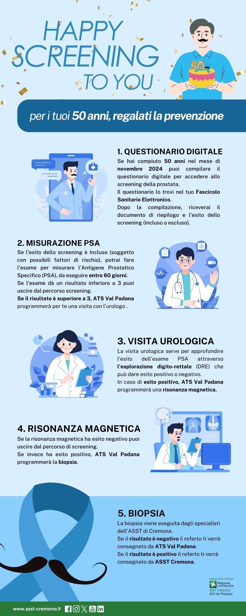 L’iniziativa coinvolge sia l’Ats Val Padana che l’Asst di Cremona. Come spiega Fabrizio Verweij (Direttore Urologia Ospedale di Cremona) «Novembre è il mese dedicato alla salute al maschile e ad una sensibilizzazione maggiore verso la prevenzione per malattie come il tumore alla prostata, ma anche il tumore alla vescica e tumore al testicolo. Chi aderisce alla campagna Happy screening, ha la possibilità – se necessario – di accedere alla visita di controllo e ad altri esami diagnostici. Il primo obiettivo è quello di far crescere la consapevolezza degli uomini rispetto al tema prevenzione: essere responsabili verso sé stessi significa non sfuggire ad un problema di salute».