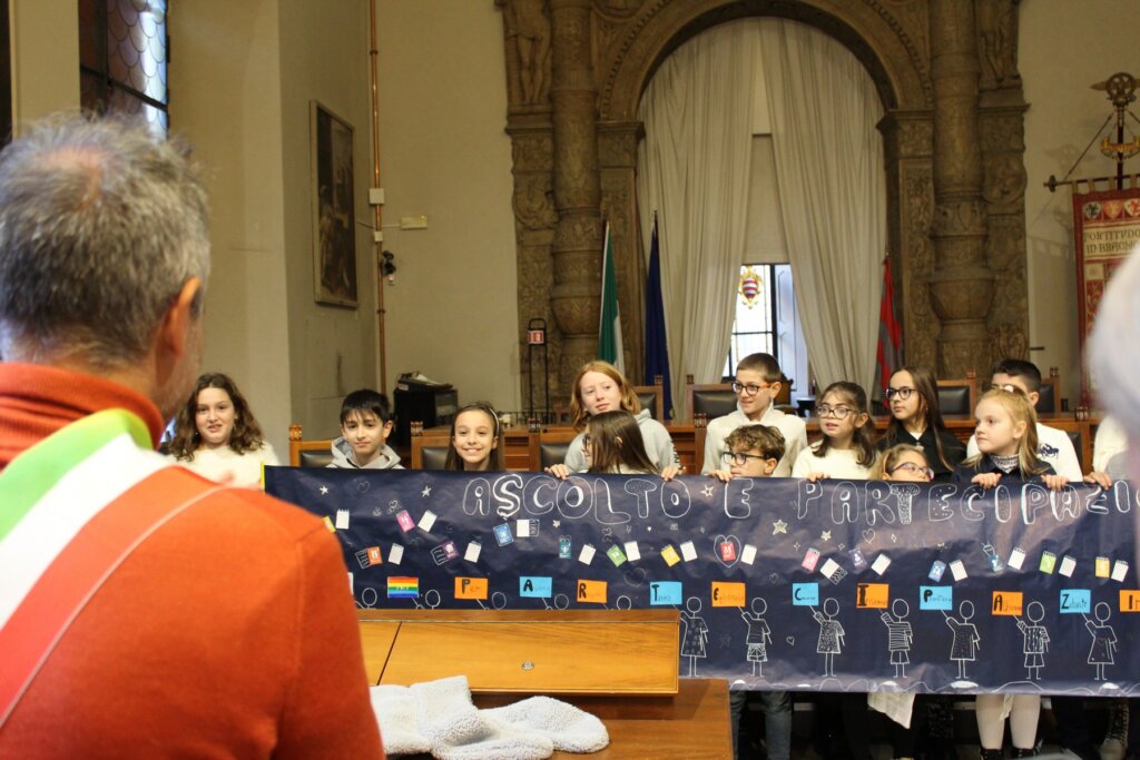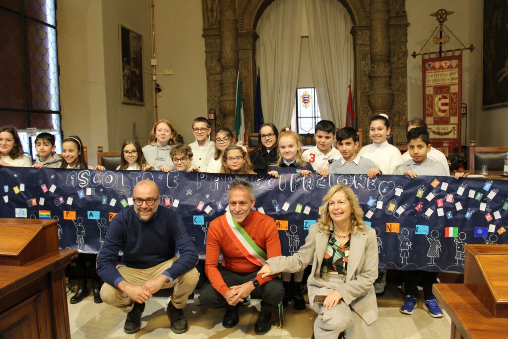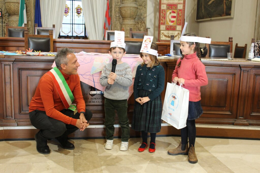 Dopo i saluti del sindaco Andrea Virgilio, dell’assessore all’Istruzione Roberta Mozzi, e dell’assessore Paolo Carletti, presente Silvia Bardelli, dirigente del Settore Politiche Educative e Istruzione del Comune, nella Sala dei Quadri di Palazzo Comunale è stata data voce ai bambini e alle bambine alunni della classe V della Scuola primaria Maria Teresa Zaniboni (Boschetto) sul diritto alla partecipazione. E’ stata poi la volta degli alunni e delle alunne delle classi IV A e IV B della Scuola primaria A. Manzoni sul diritto di esprimersi (libertà di pensiero e scelta).