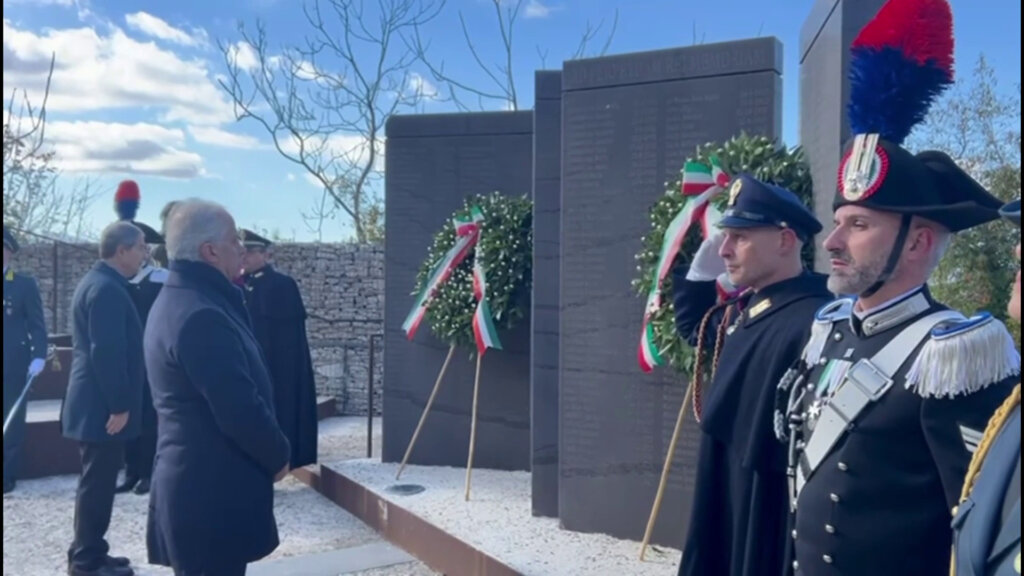 SANT’ANGELO DEI LOMBARDI (AVELLINO) (ITALPRESS) – I ministri dell’Interno e della Protezione Civile, Matteo Piantedosi e Nello Musumeci, al Parco della Memoria a Sant’Angelo dei Lombardi per la deposizione di una corona alla Lapide in memoria delle vittime del terremoto del 23 novembre 1980 in Irpinia.
