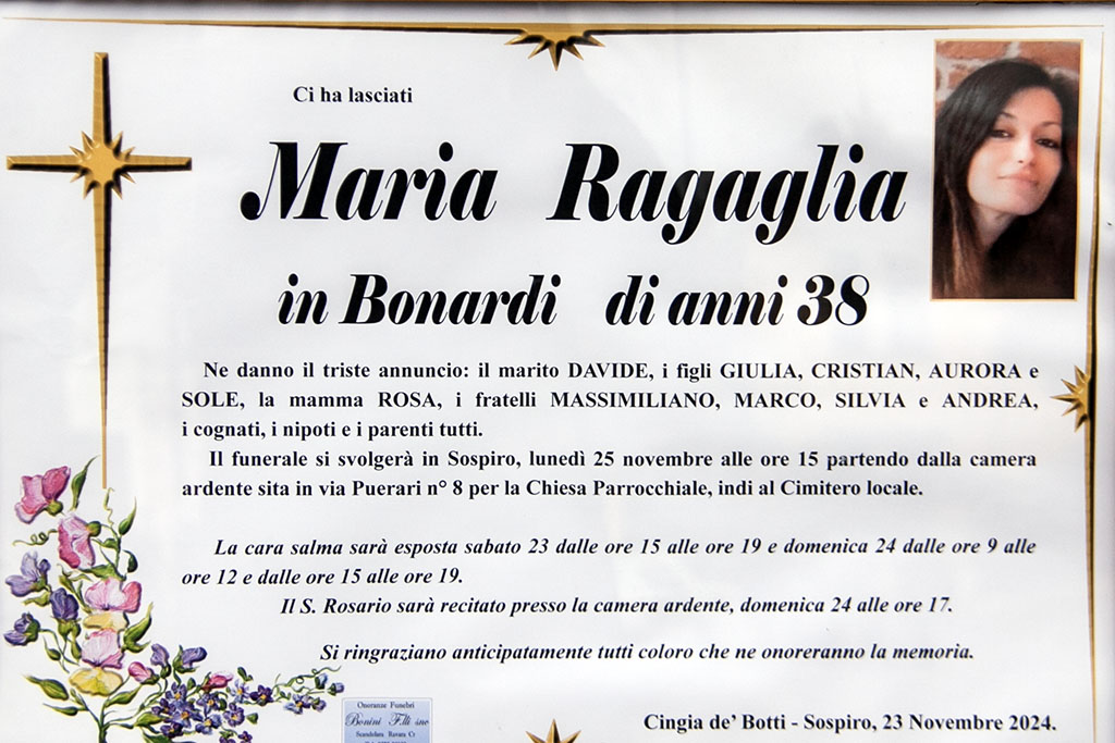 È stata una chiesa gremita ad accogliere il feretro di Maria Ragaglia, 38enne madre di quattro figli morta dopo un tragico incidente lo scorso venerdì a Derovere. Il funerale ha avuto luogo nel pomeriggio di lunedì a Sospiro, paese dove Maria era nata ed dove aveva vissuto fino a pochi anni fa, prima di trasferirsi con la famiglia a Cingia de’ Botti; a celebrarlo il sacerdote di Sospiro don Ernesto Marciò, insieme a quello di Cingia, don Ettore Conti.
