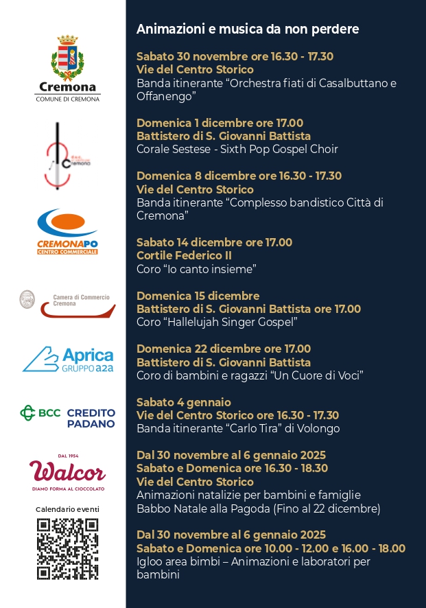 Su tutto il materiale informativo e promozionale è presente l’indirizzo della pagina dedicata del sito del Comune (https://www.comune.cremona.it/vivere-comune/eventi/cremona-illumina-natale-2024) che ospita il calendario, in costante aggiornamento, di tutti gli eventi in programma da sabato 30 novembre al 6 gennaio 2025, nonché un QR Code da inquadrare con il proprio smartphone per visualizzare i vari appuntamenti.