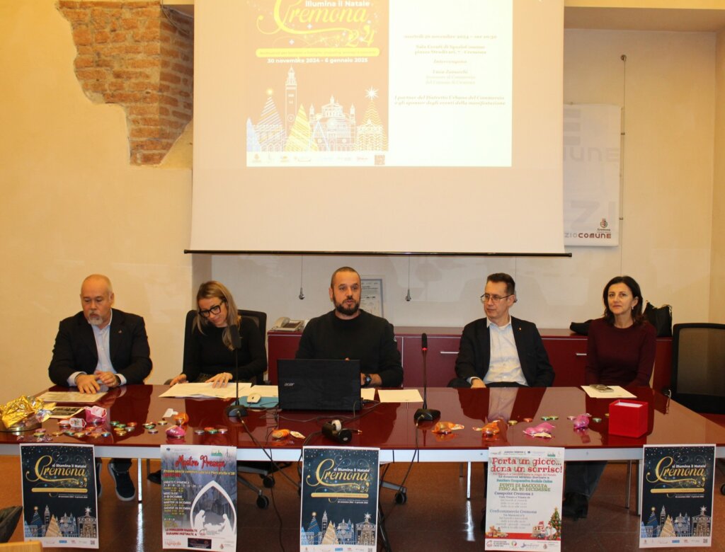 Presentate questa mattina le iniziative di Comune e commercianti (Duc) per animare il periodo natalizio a Cremona. Da sabato 30 novembre al 6 gennaio 2025 animazioni per bambini e famiglie, tante luci, shopping, presepi e concerti, per una serie di inziative pensate per supportare e rilanciare il centro storico e i negozi di vicinato durante il periodo che precede e segue il Natale.