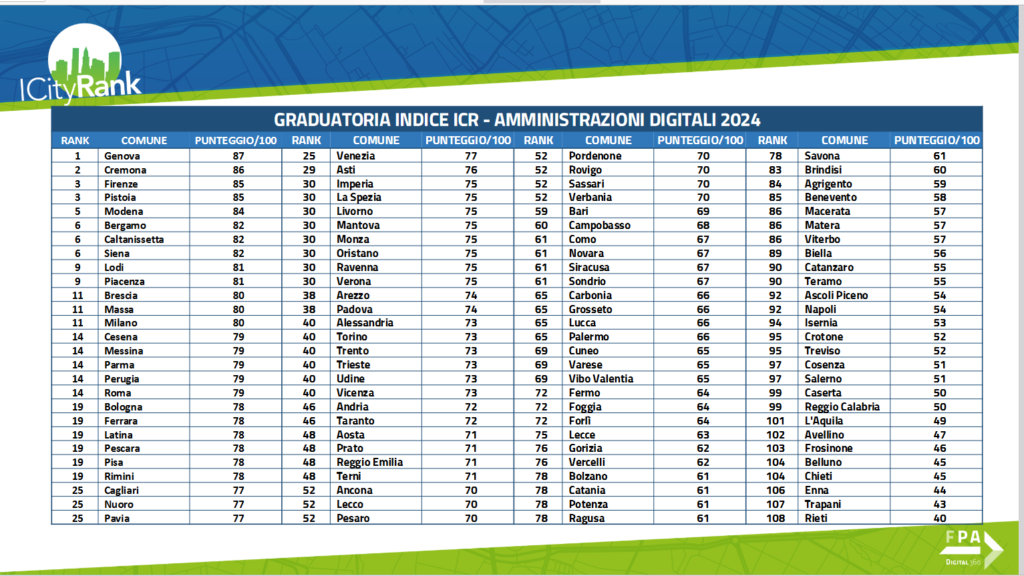 “ICity Rank 2024 mostra un miglioramento nella trasformazione digitale dei Comuni capoluogo, con una crescita in tutti e tre gli indici, evidente soprattutto nella dimensione “Amministrazioni digitali”, dove il valore medio cresce di ben 8 punti, spinto anche dalle prime implementazioni dei progetti PNRR – spiega Gianni Dominici, Amministratore Delegato di FPA –. Questo dimostra come buona parte delle città italiane sia riuscita a cogliere le opportunità offerte delle tecnologie per digitalizzare servizi e funzioni ‘tradizionali’. La sfida ora si sposta nel creare nuovi meccanismi creativi e aperti per coinvolgere tutti gli attori urbani dell’innovazione nella prospettiva delle ‘responsive city’, città capaci di utilizzare il patrimonio di informazioni, strumenti di comunicazione e capacità elaborativa per migliorare i processi partecipativi e decisionali”.