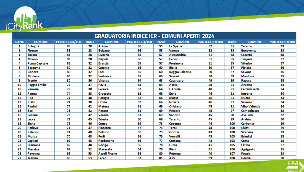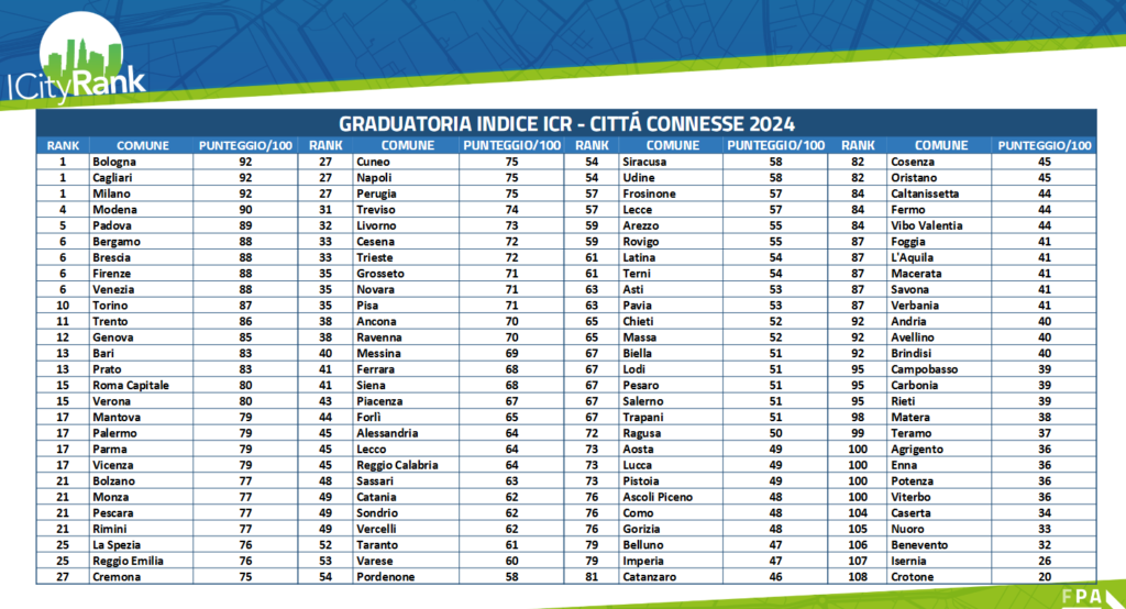Sono i risultati di ICity Rank 2024, la ricerca annuale sulla trasformazione digitale dei 108 Comuni Capoluogo realizzata da FPA, società del gruppo DIGITAL360, e presentata oggi a FORUM PA Città, l’evento dedicato all’innovazione urbana e tappa conclusiva del percorso di lavoro dell’ICity Club.