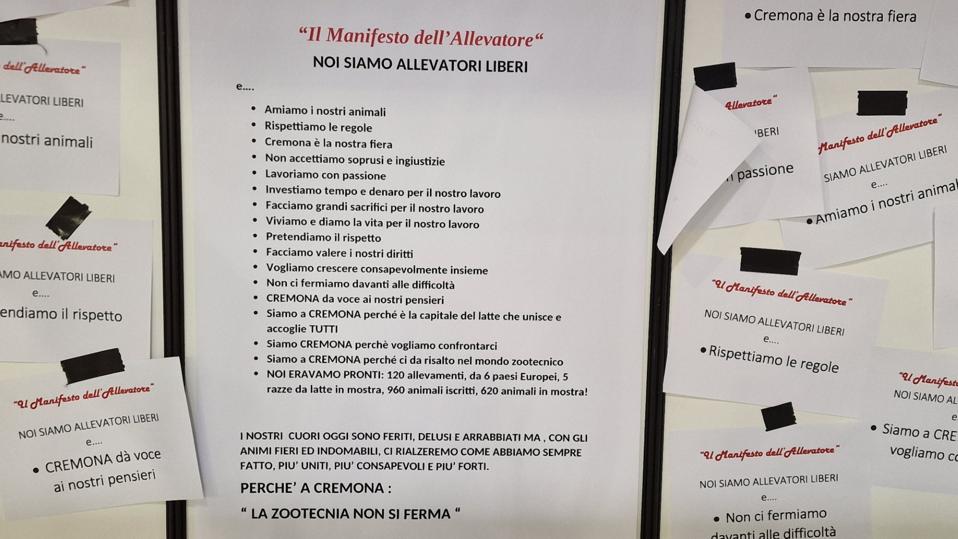 “Noi siamo allevatori liberi, rispettiamo le regole, non accettiamo soprusi e ingiustizie, facciamo grandi sacrifici, investiamo nel nostro lavoro, Cremona è la nostra fiera. Noi eravamo pronti, 120 allevamenti da 6 Paesi europei, 5 razze da latte in mostra, 620 animali in mostra”.