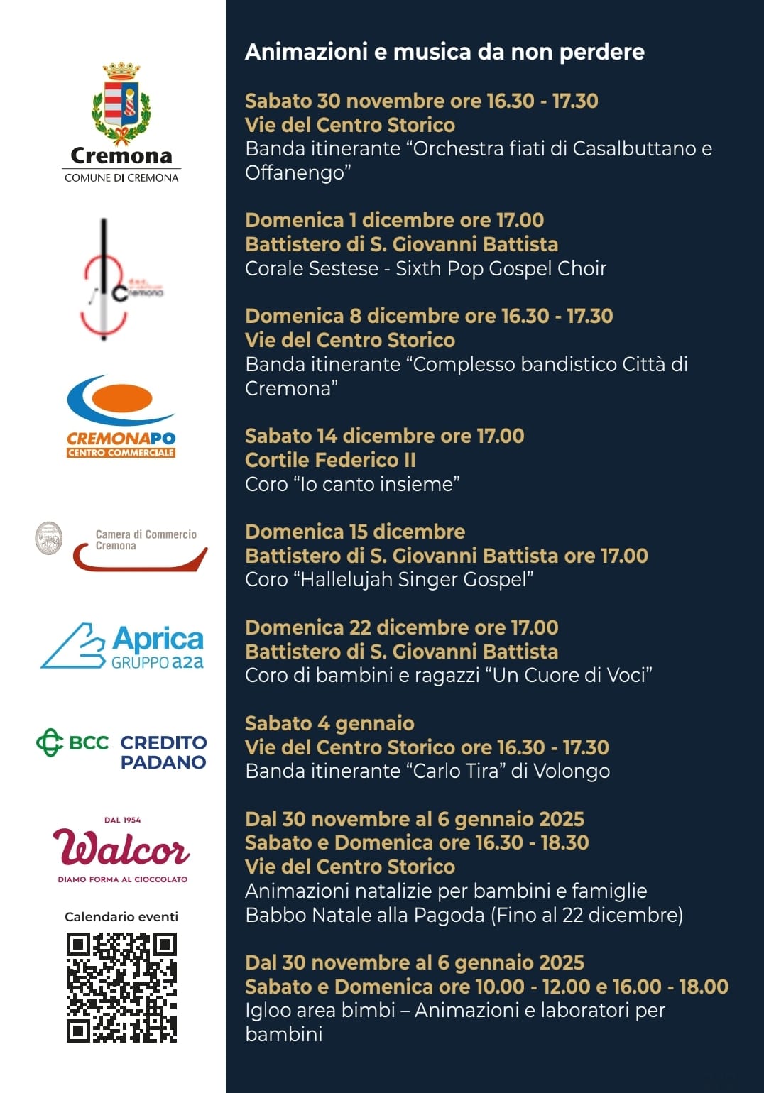 Sabato 30 novembre alle 16:30, in Piazza del Comune verrà acceso un albero di Natale luminoso di 17 metri di altezza, che veglierà sulla città per tutto il periodo natalizio e sarà lo sfondo perfetto per immortalare nei propri ricordi la bellezza di Cremona. Subito dopo, un corteo guidato dalla “Orchestra Fiati di Casalbuttano e Offanengo” darà il via ai festeggiamenti natalizi, accompagnando i partecipanti nelle vie del centro per l’inaugurazione di altre attività inserite nel programma.