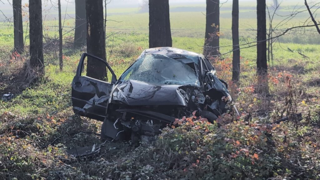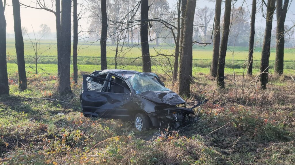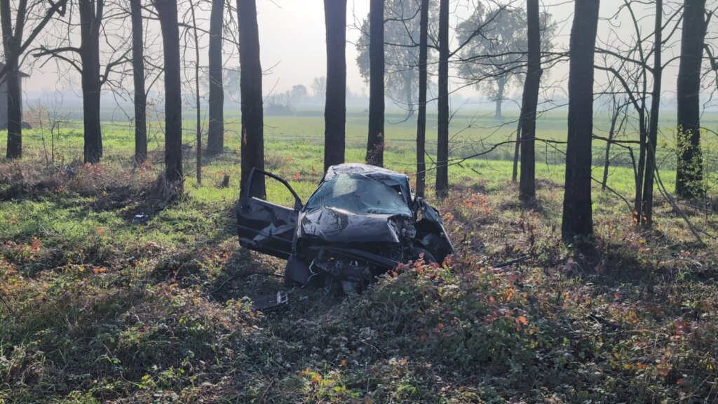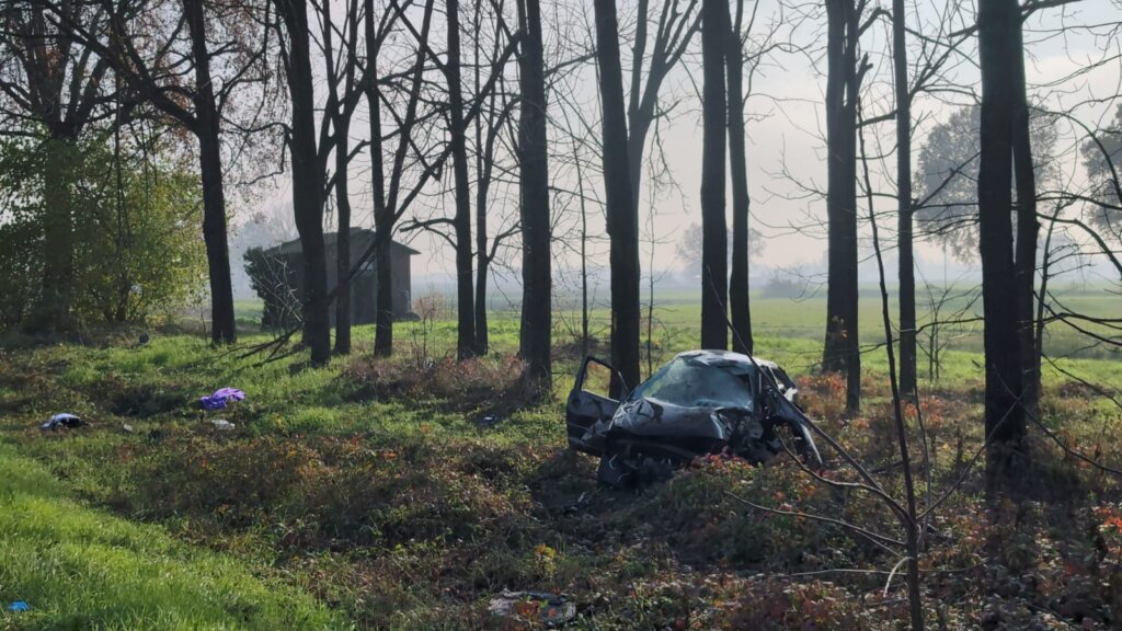 Un’auto, probabilmente proveniente da sud, ha perso il controllo finendo contro gli alberi a lato strada e risultando completamente distrutta.