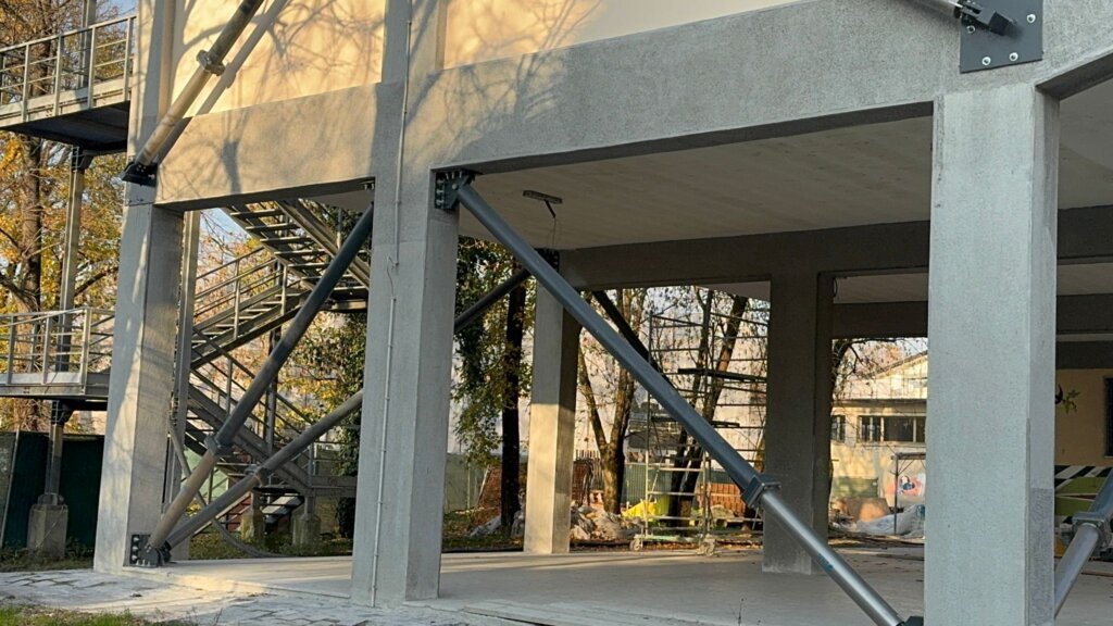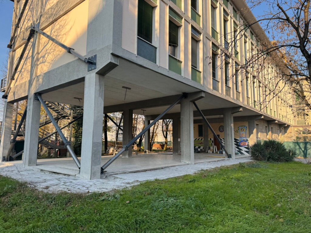 I lavori si erano resi necessari in quanto la struttura esistente non è in grado di assorbire le sollecitazioni del sisma previste dalla normativa vigente. Le misure di adeguamento hanno previsto, tra l’altro, l’inserimento di elementi metallici di controvento – le travi, appunto – in alcuni casi posti all’esterno in facciata, in altri all’interno mascherati con le tamponature e, laddove non possibile dal punto di vista tecnico, lasciati a vista.