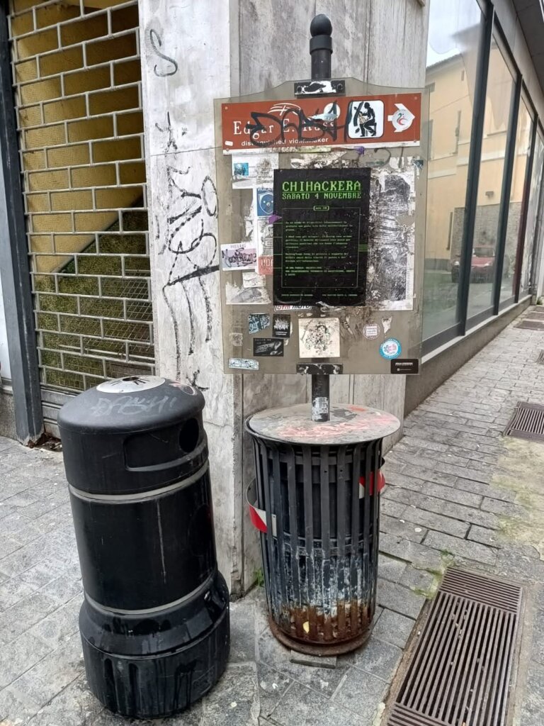 mesi fa si era chiesta la sostituzione del cestino e relativo cartello turistico in via Mauro Macchi, angolo corso Mazzini, scrivevamo “…vicino al contenitore per i rifiuti, c’è un cesto a tulipano chiuso (in parte arrugginito) per evitare venga usato come porta rifiuti e mozziconi. Sulla sommità spunta una palina a sostegno di un pannello a uso commerciale per liutai. Fanno bella mostra di se i graffiti illeggibili sulla parete e sul pannello, mai rimossi.